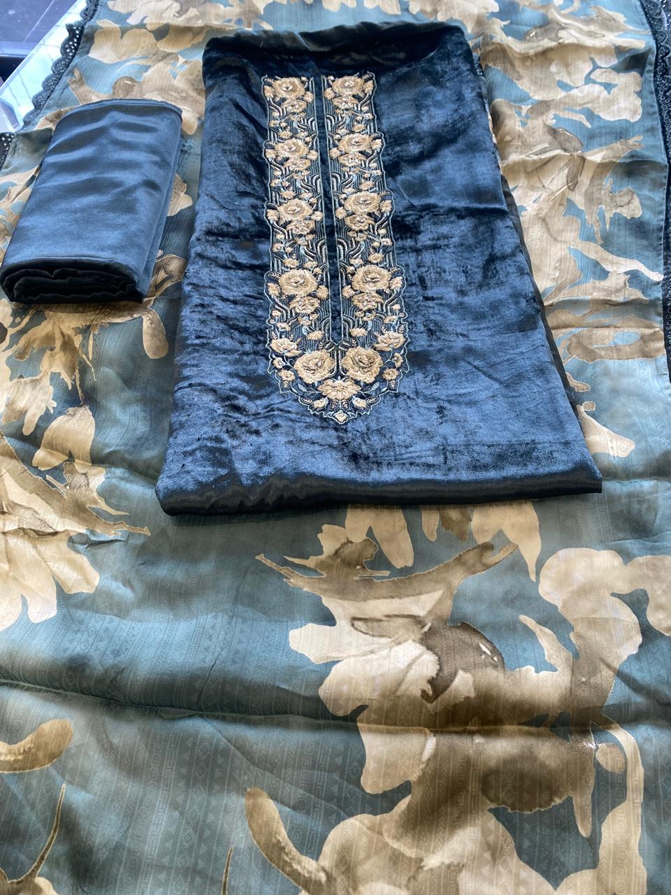 Immerse yourself in timeless elegance with this Graceful Velvet Suit, crafted to reflect luxury and refined artistry. The rich velvet fabric offers a regal drape, while intricate zari floral embroidery adorns the neckline, adding a subtle touch of sophistication. Perfect for festive occasions, weddings, and celebrations, this ensemble beautifully blends traditional craftsmanship with modern grace. Style it with statement accessories for a complete festive look.